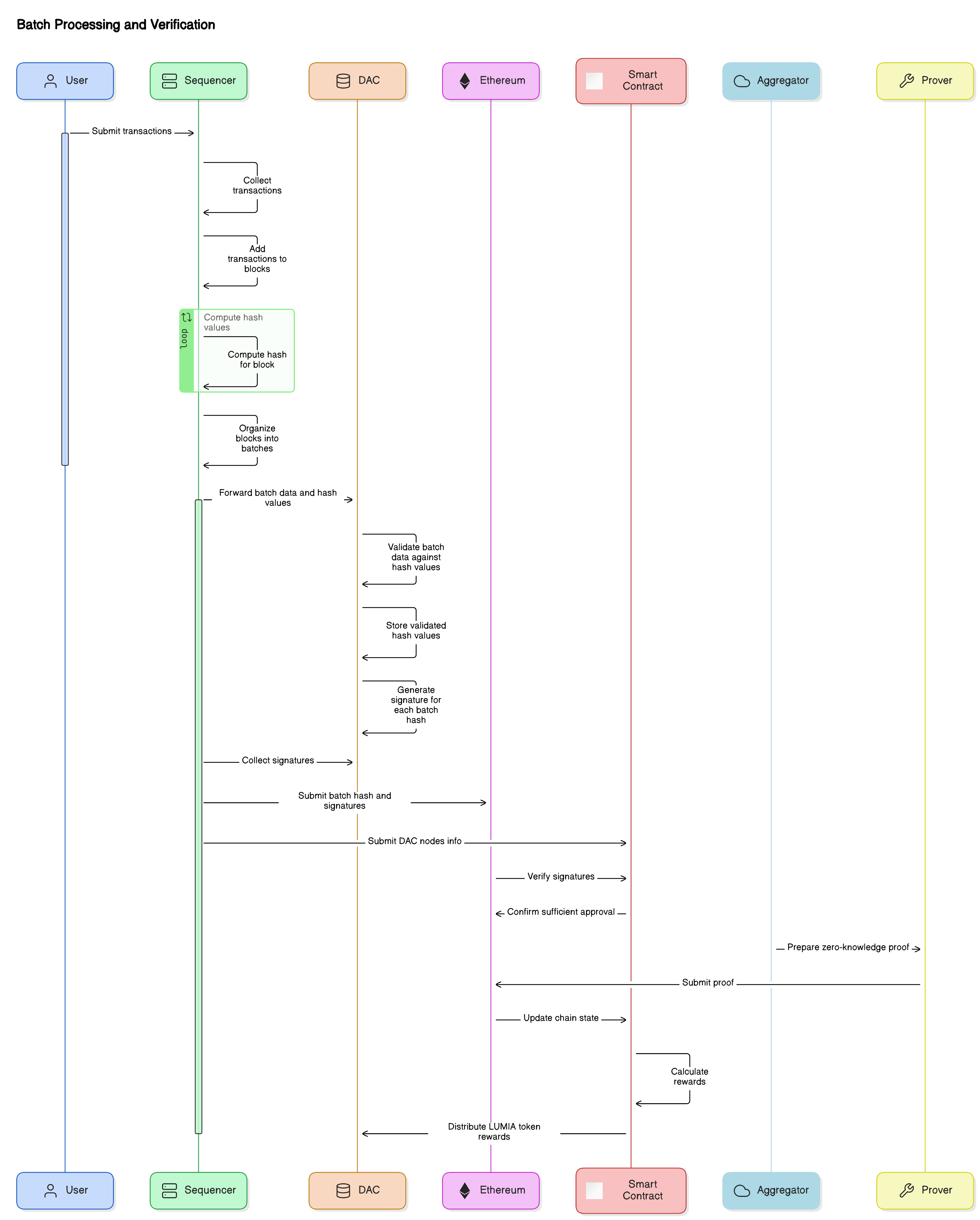 7. ***Final Settlement with Zero-Knowledge Proof and Reward Calculation:*** The aggregator prepares a proof for the batch using the prover and submits it to the Ethereum network. This proof confirms the validity of the transactions in the batch without revealing transaction details, and the chain's state is updated on Ethereum. After successful settlement, the reward distribution smart contract calculates the rewards for each participating node based on factors such as the number of delegated NFTs, uptime, and fees. The contract then distributes the LUMIA token rewards to the DAC nodes and their delegators according to the calculated amounts.